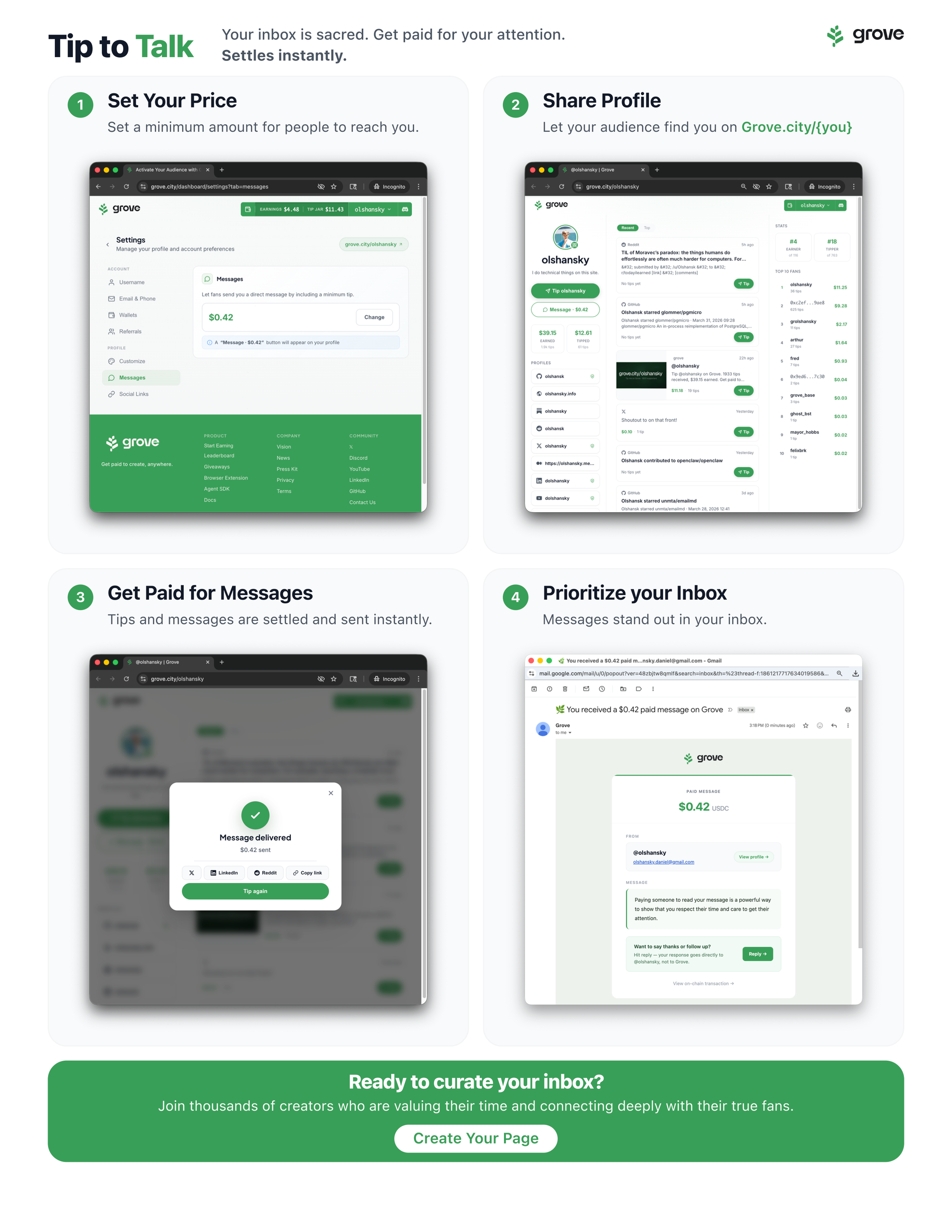 At Grove, we’re building this in as a core feature. Tipping to get a message across is a fundamental primitive of a wallet-first, agent-friendly Linktree.